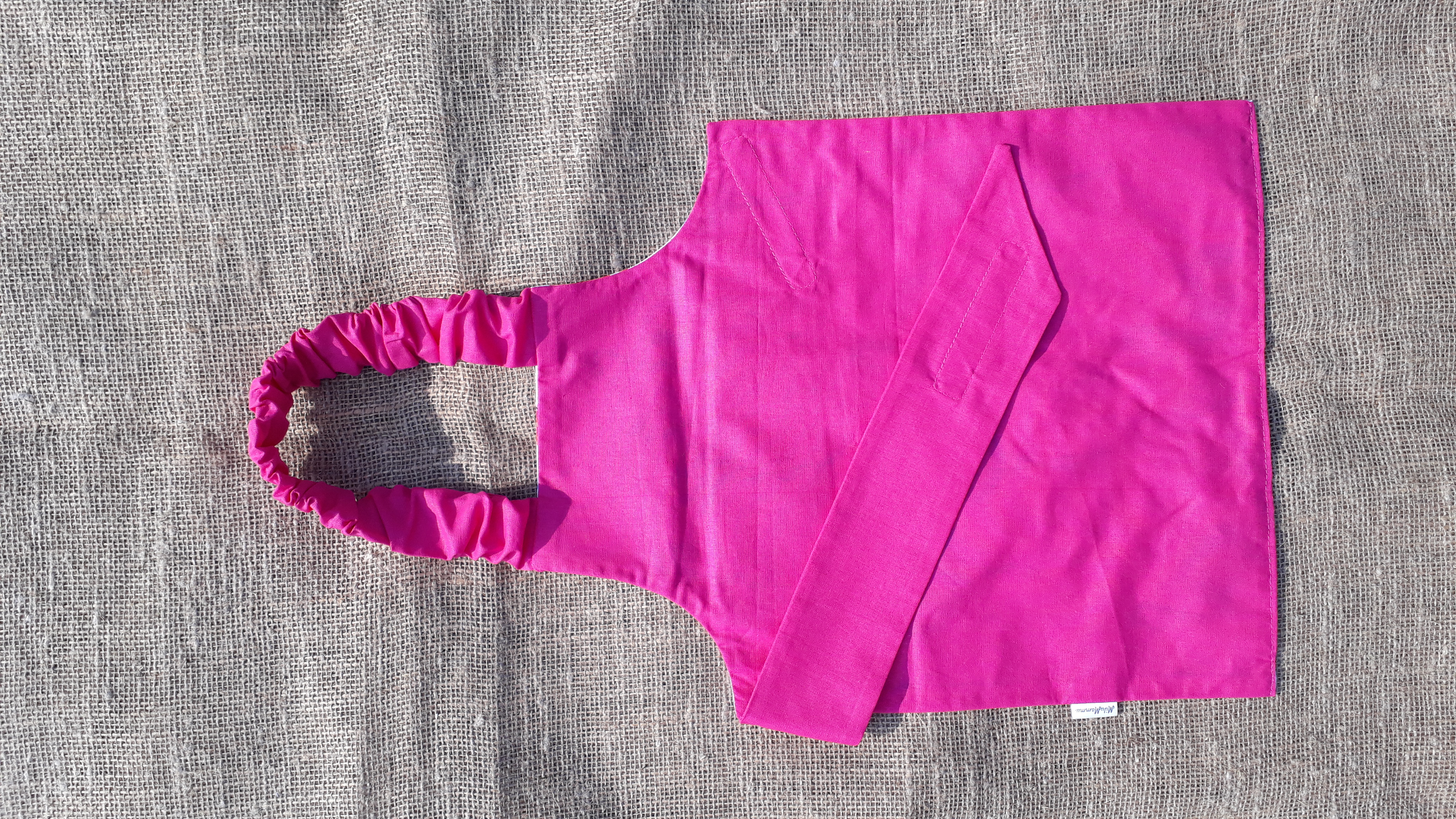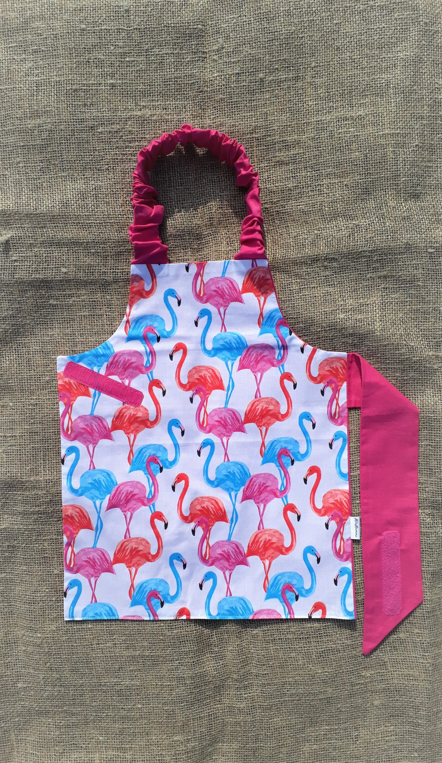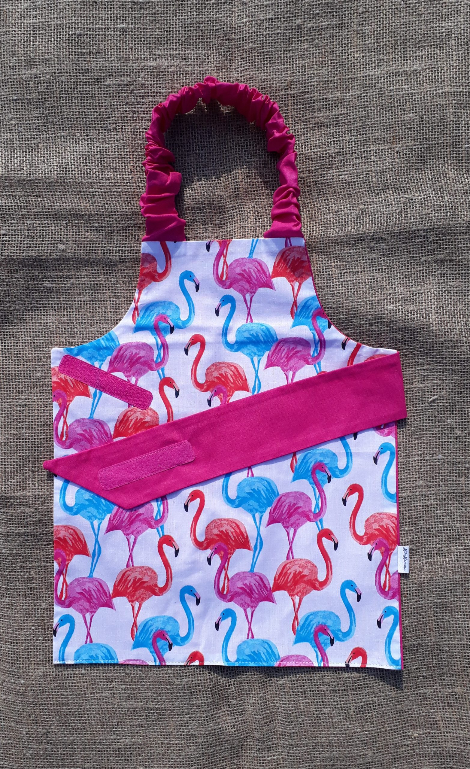 Priekšauta kakla daļā ir izmantota gumija, ko bērns viegli var aplikt, un jostas daļai ir piešūta lipekļa lente, lai bērns pats varētu to viegli aiztaisīt.