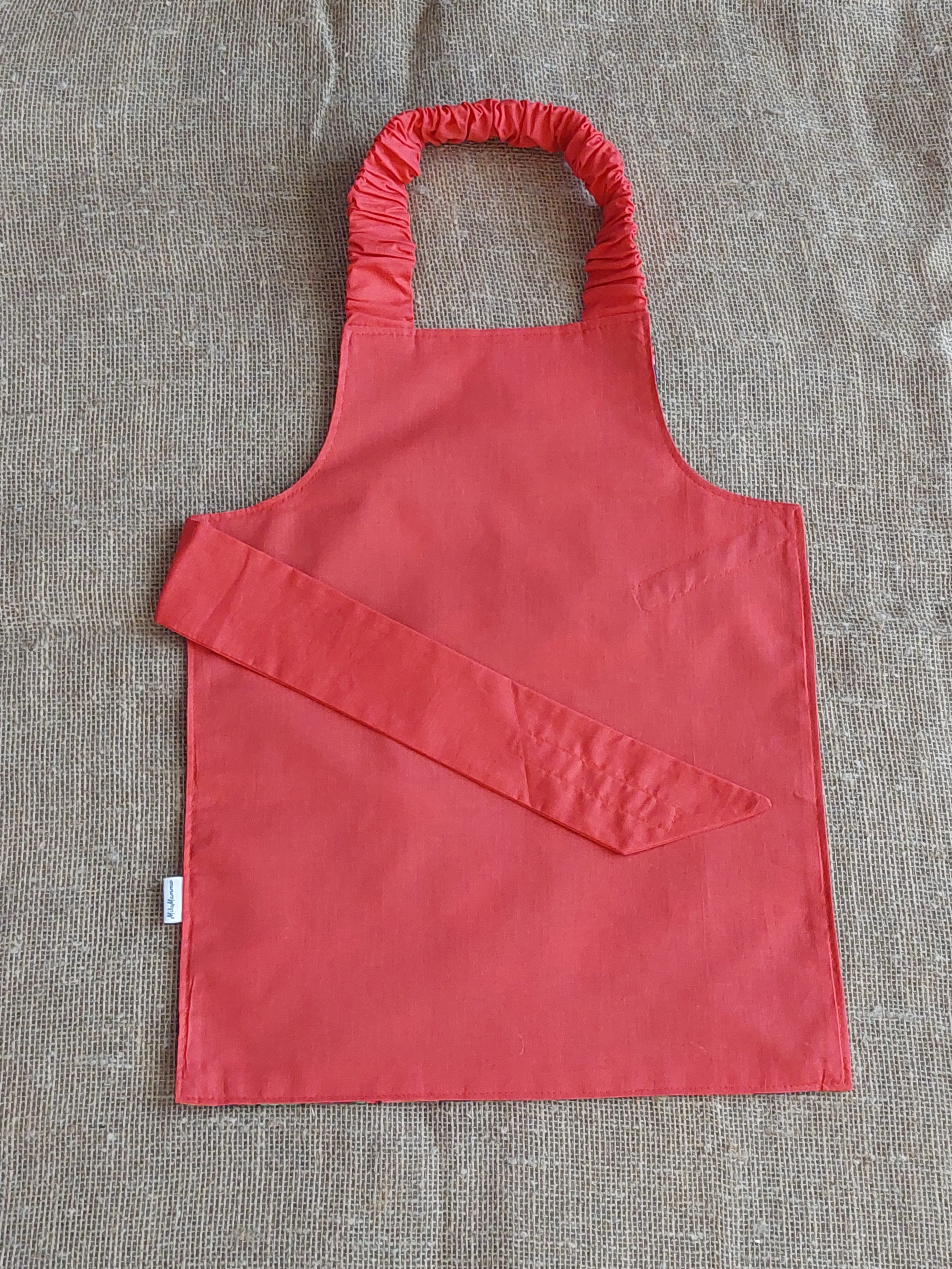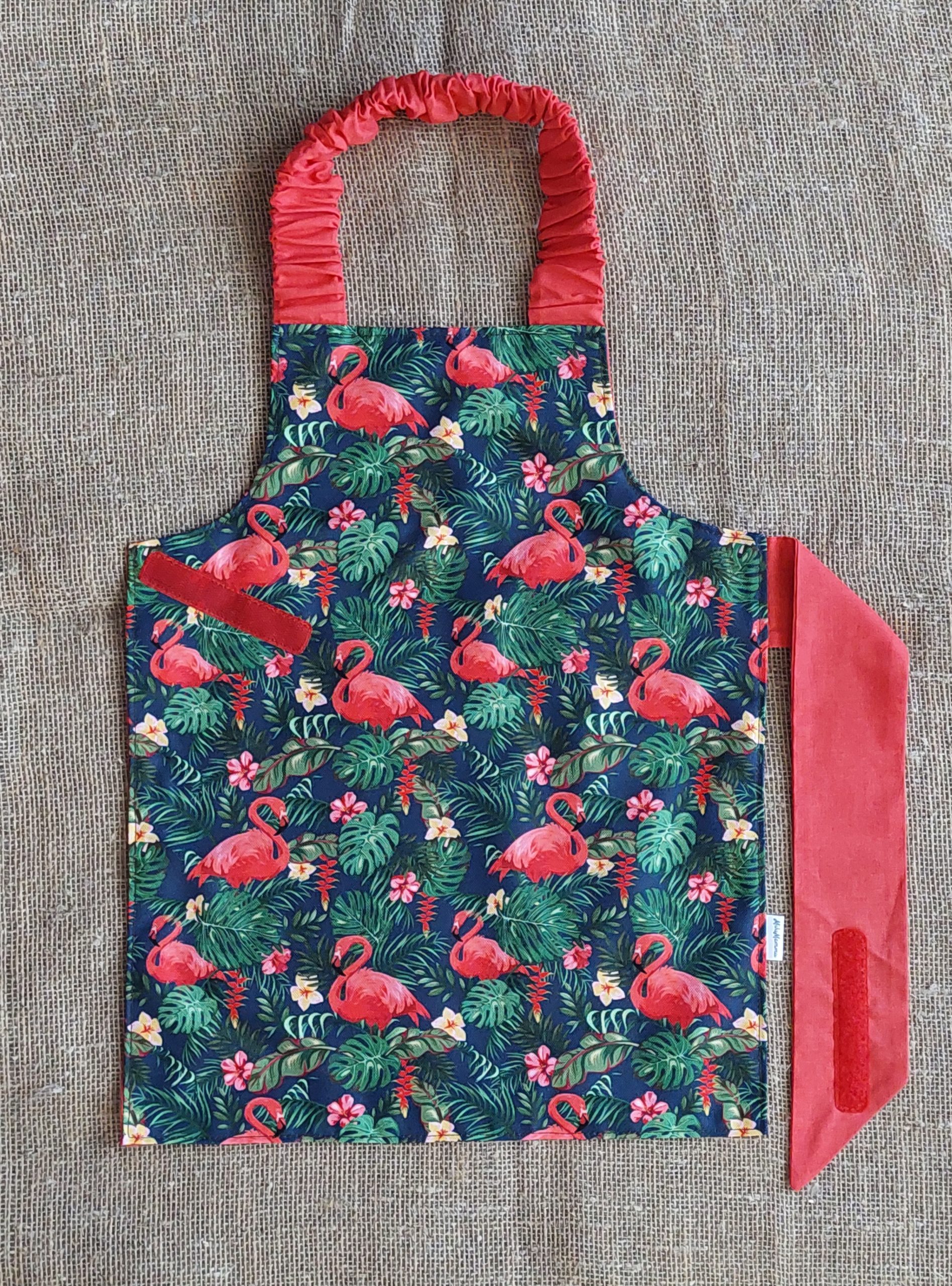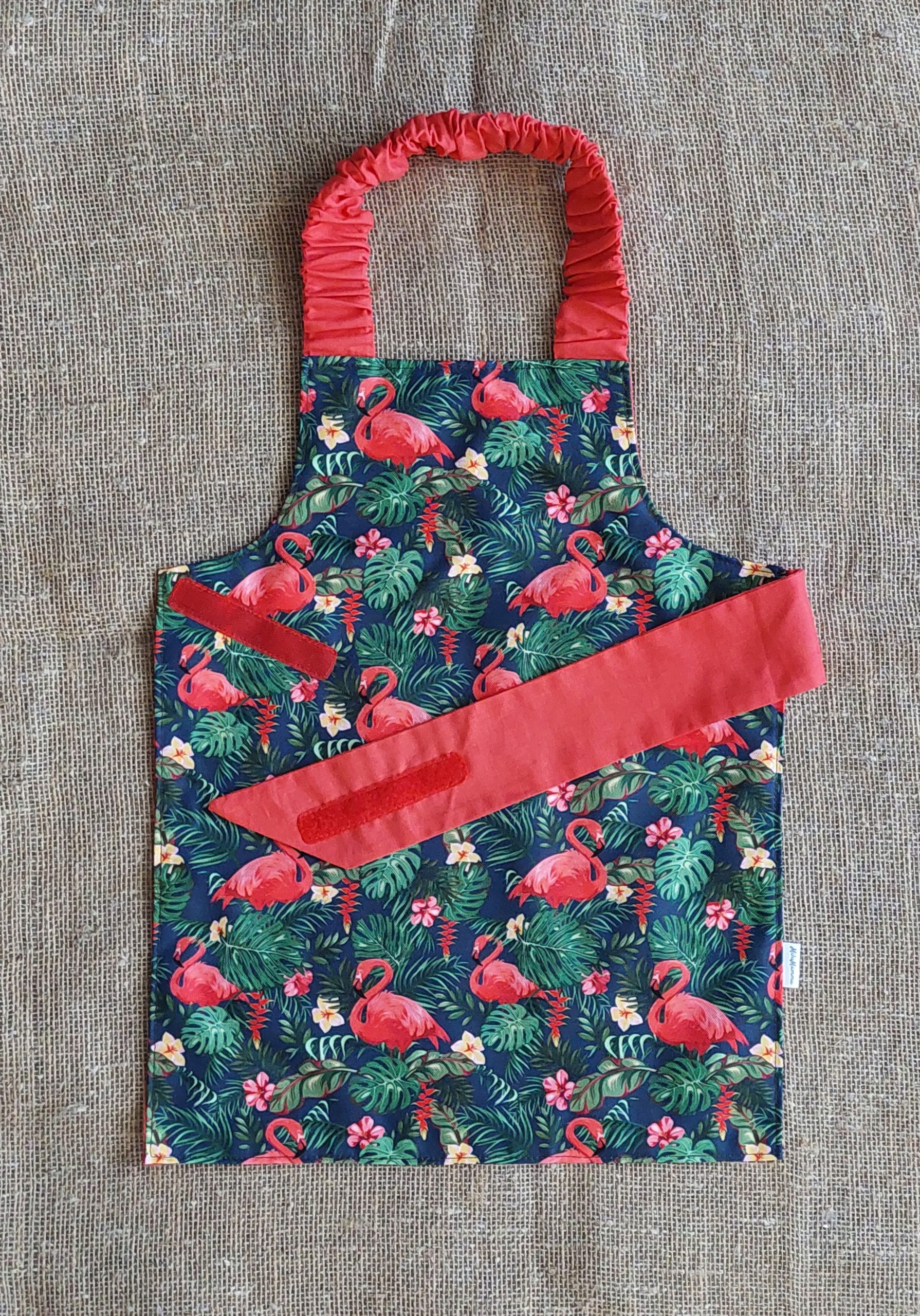 Priekšauta kakla daļā ir izmantota gumija, ko bērns viegli var aplikt, un jostas daļai ir piešūta lipekļa lente, lai bērns pats varētu to viegli aiztaisīt.