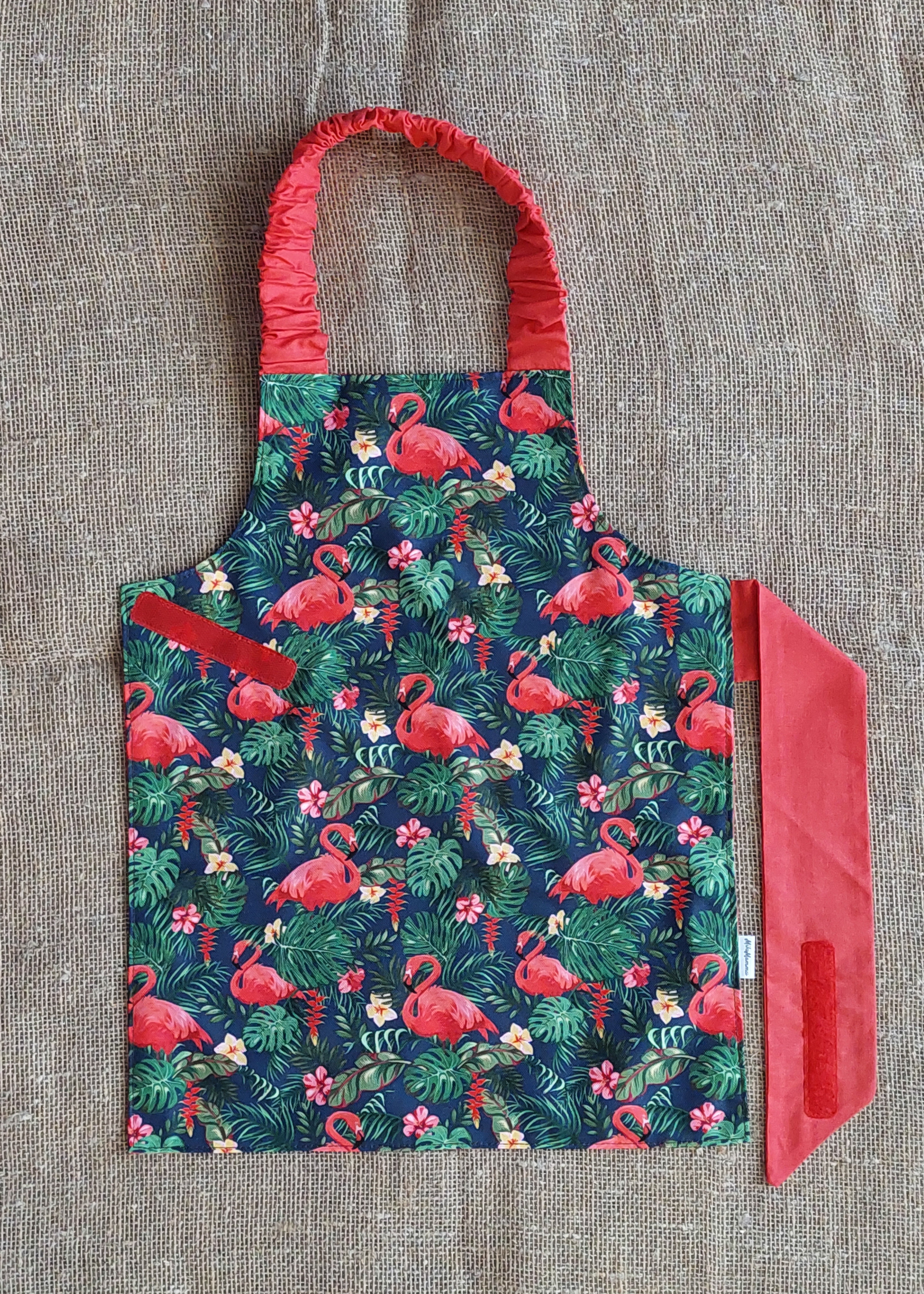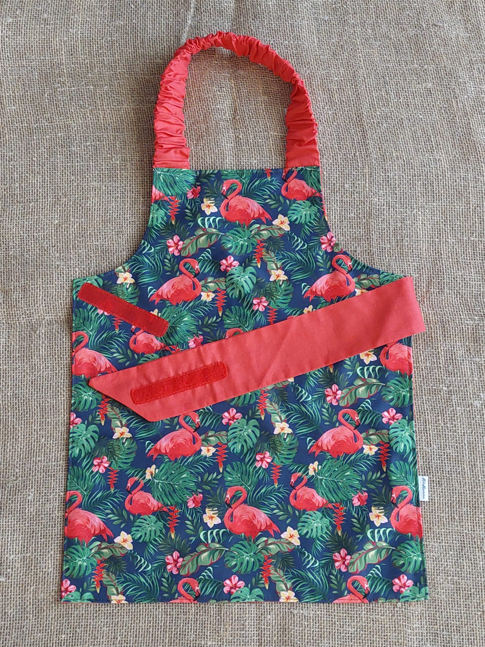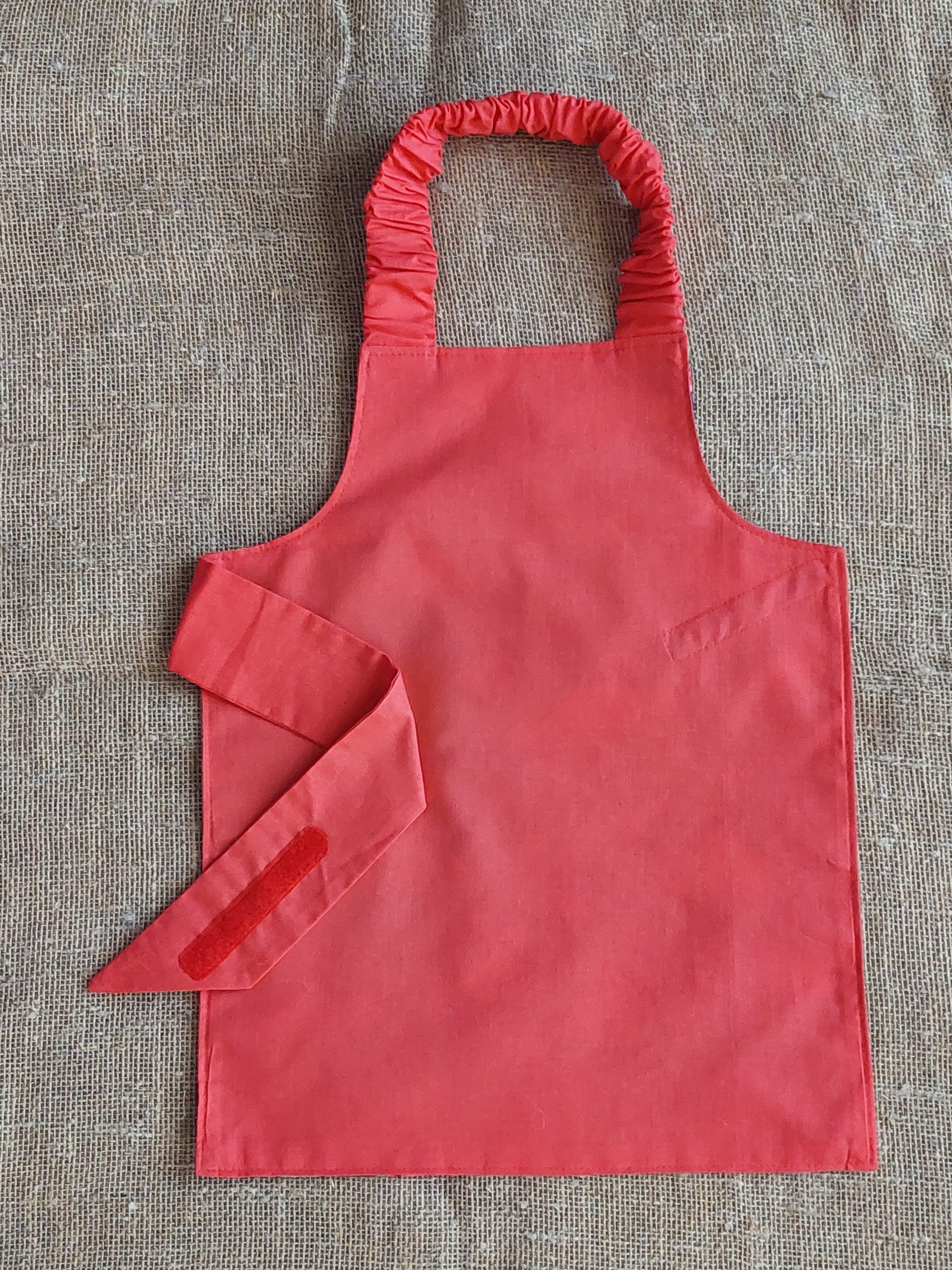 Priekšauta kakla daļā ir izmantota gumija, ko bērns viegli var aplikt, un jostas daļai ir piešūta lipekļa lente, lai bērns pats varētu to viegli aiztaisīt.